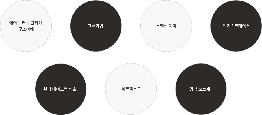 메이크업 전문아티스트 과정을 이수 하였거나 실력을 갖춘 분들을 대상으로 하는 심화교육 과정입니다.에어브러쉬는 기존 퍼프, 브러쉬를 이용하는 기존 방식과 달리 공기의 압력을 이용하여 파운데이션을 얼굴에 분사하는 방식의 메이크업이며 다양한 에어브러쉬 기법을 통해 실무에서 활용할 수 있는 뷰티메이크업 테크닉을 익히는 교육 과정입니다.